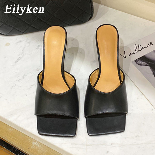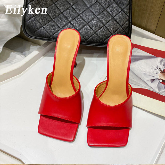 Eilyken 2022 New Summer Cozy Soft PU Leather Square Toe Women High Heel Mules Slippers Fashion Outdoor Party Dress Ladies Shoes